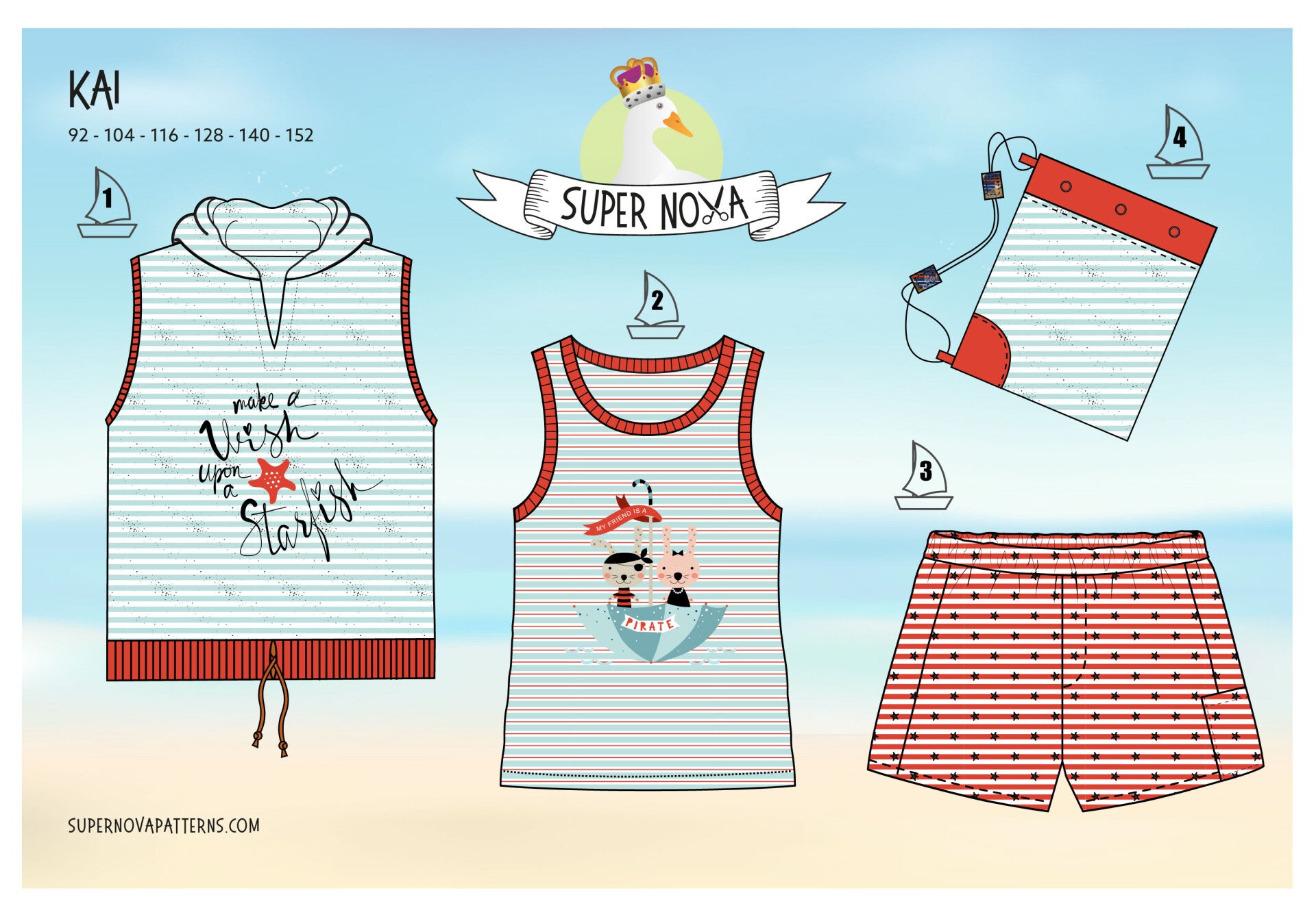 Patroon met mouwloze sweater, hemd, korte (zwem)broek en tas in de maten 92-104-116-128-140-152: